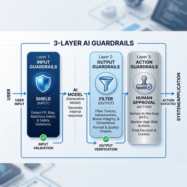 When AI escapes laboratories and enters actual operation environments (CRM updates, payments, etc.), risks like data leak or wrong actions occur. Therefore, a powerful Triple Guardrail architecture for regulation compliance and security is essential.